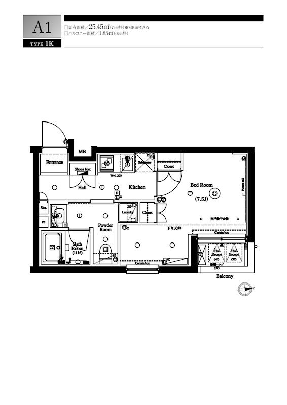 | 間取り | 1K | 面積 | 25.45㎡ |